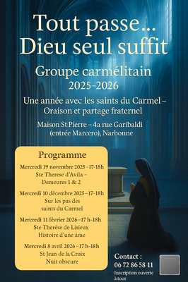 Découvrez le programme 2025-2026 du groupe carmélitain, une année avec les saints du Carmel - Oraison et partage fraternel. Il se réunit à la Maison St Pierre de Narbonne.