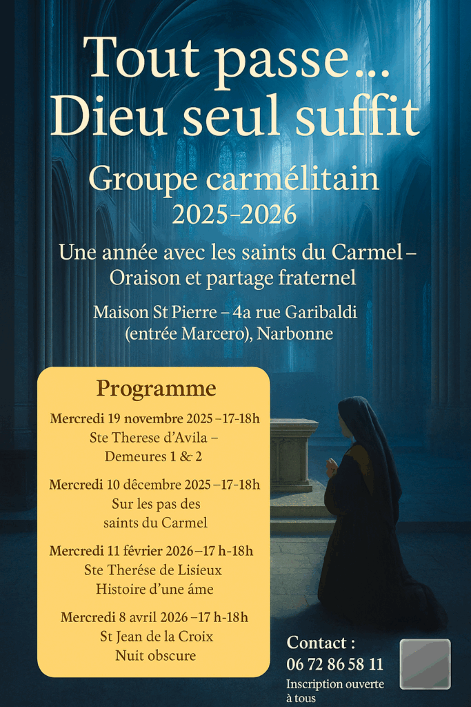 Une année avec les saints du Carmel – Oraison et partage fraternel. Il se réunit à la Maison St Pierre de Narbonne.
