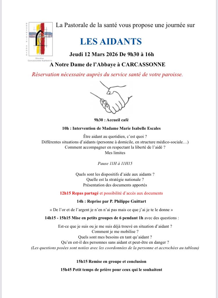 Jeudi 12 Mars 2026 de 9h30 à 16h à Notre-Dame de l’Abbaye à Carcassonne. Réservation nécessaire auprès du service santé de votre paroisse.