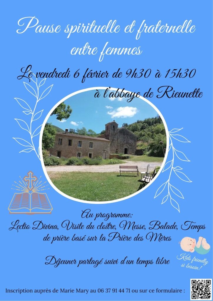 À l’initiative de deux paroissiennes de Saint-Michel-en-Lauragais, une pause spirituelle est proposée à toutes les femmes du diocèse intéressées. Elle se déroulera à Rieunette le vendredi 6 février à l’Abbaye Cistercienne Sainte-Marie de Rieunette – 11250 Ladern-sur-Lauquet – 04 68 69 69 06
