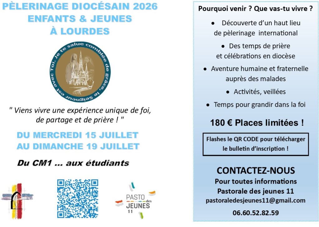 Du 15 au 19 juillet 2026 prochain, la pastorale des jeunes et des enfants invite tous les jeunes, du CM1 jusqu’à l’université, à vivre à Lourdes une expérience unique de foi, de partage et de prière.