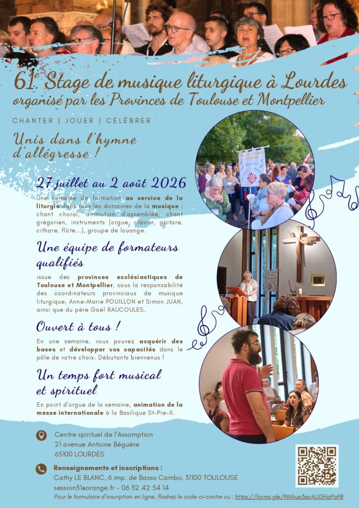 Du lundi 27 juillet 13h30 au dimanche 2 août 15h 2026 se déroulera le 61e stage de musique liturgique organisé par les provinces de Toulouse et de Montpellier. Cette année encore le stage se déroulera à Lourdes où nous serons accueillis au Centre d’accueil de l’Assomption à Lourdes (face à la Grotte).