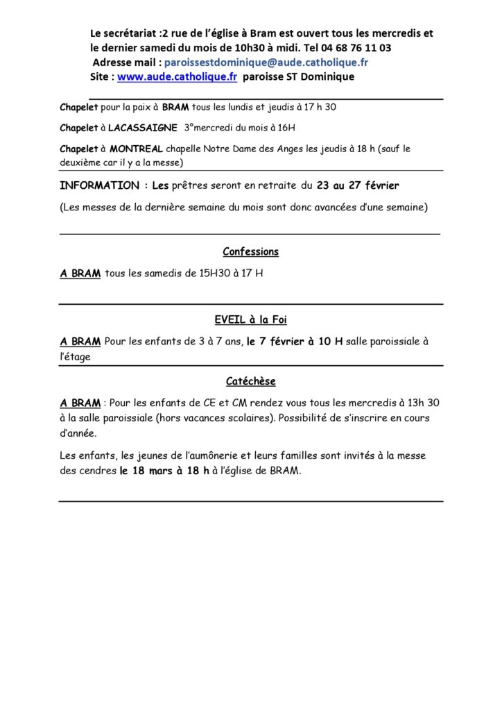 - Confessions tous les samedis de 15h30 à 17h à l’église de Bram