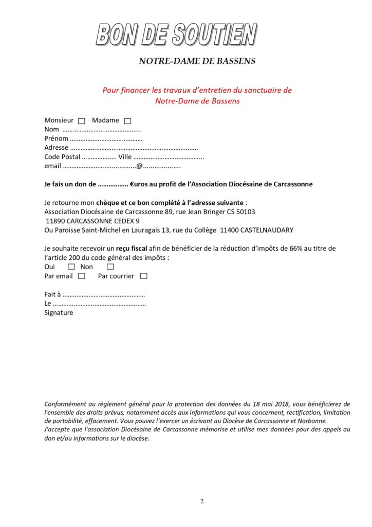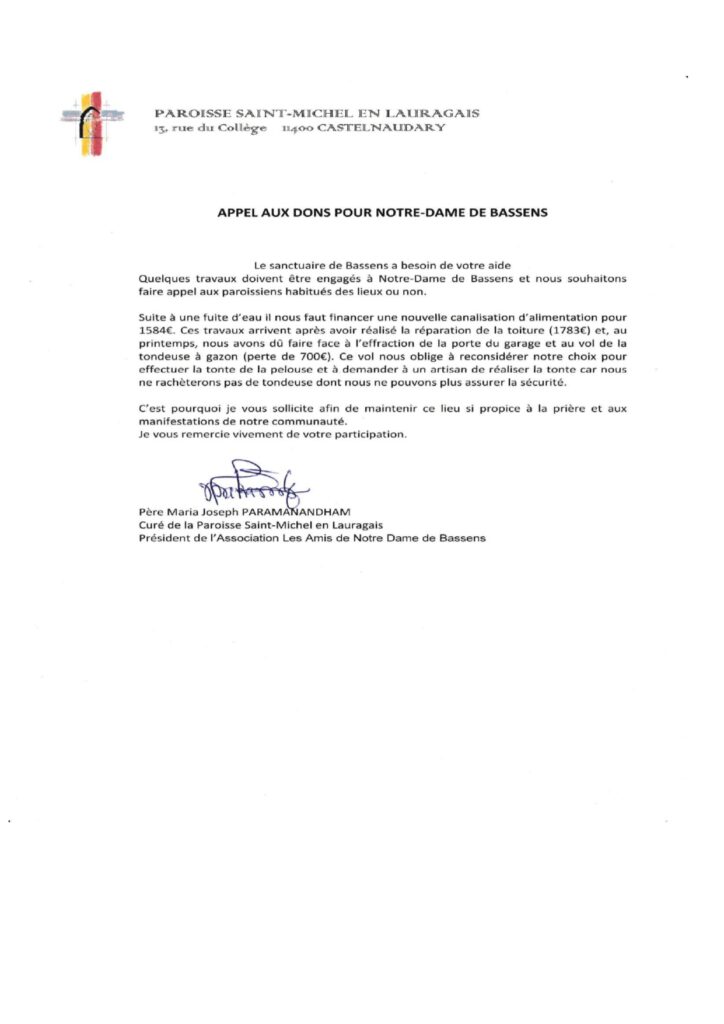 - Aumône : Participer au denier du culte et à la quête pour renouveler les carnets de chants (le surplus éventuel irait pour les sinistrés des incendies).
