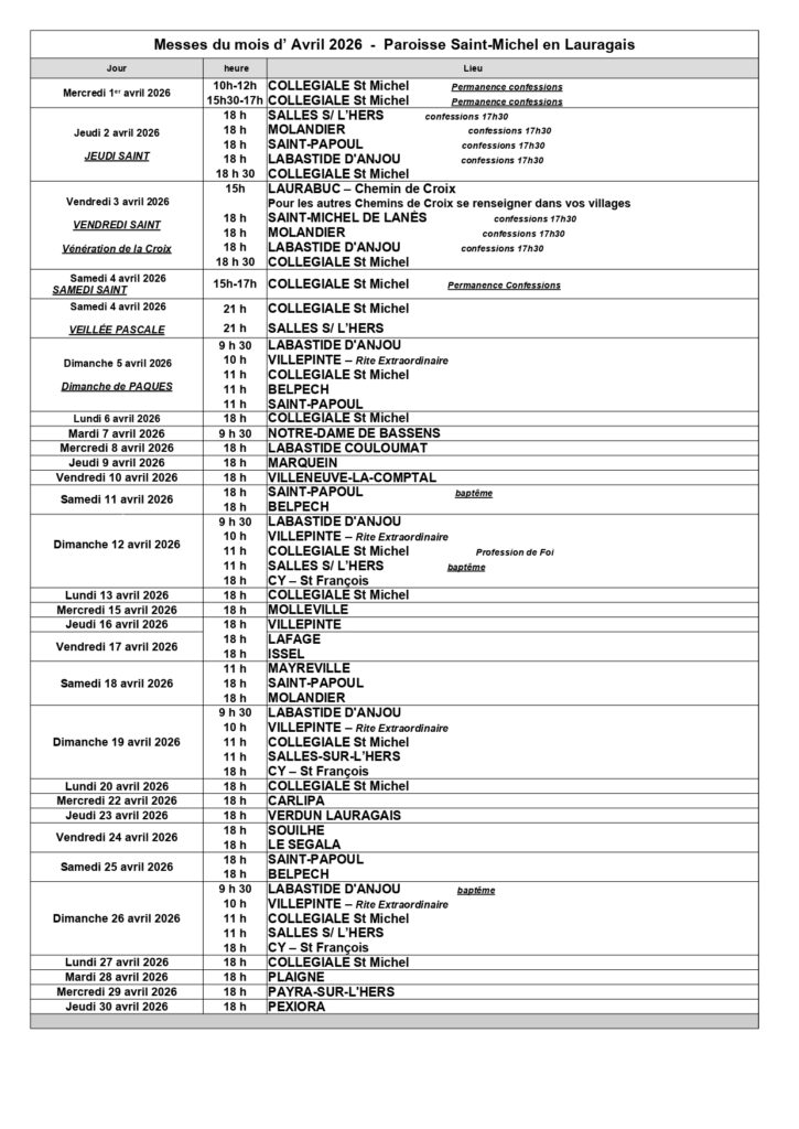 Les horaires des messes tout au long de l’année
