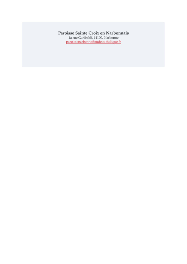 Dans cette rubrique, vous pouvez vous inscrire aux lettres paroissiales. Elles contiennent des nouvelles de la paroisse, des éditoriaux, des méditations, des dates importantes, ainsi que des échos des événements vécus en communauté. Un bon moyen de rester informé(e) et de nourrir sa vie spirituelle au fil des semaines. Ecrivez à paroissenarbonne@aude.catholique.fr