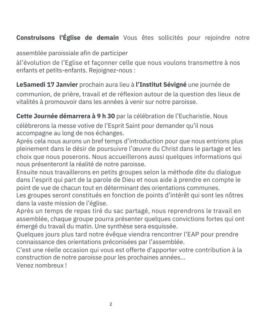 Après ces assemblées, Monseigneur Valentin viendra dans chaque paroisse entre janvier et avril 2026 pour écouter vos réflexions et poursuivre le dialogue. Votre voix compte. Rejoignez-nous ! Pour plus d’informations contactez votre paroisse :
