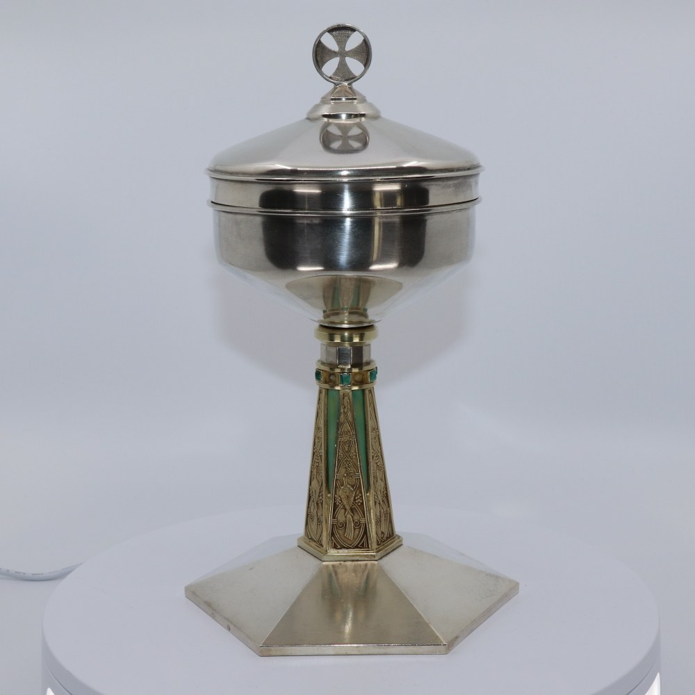 Un Ciboire de forme art déco et avec un pied hexagonal sans décor. La tige est rythmée de 6 triangles présentant le même décor sur chaque : un paon mangeant du raisin.