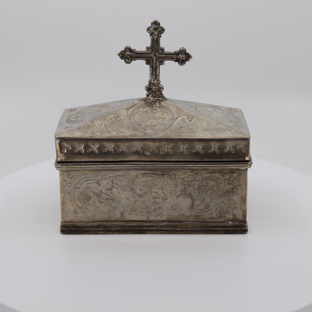 Une boîte rectangulaire au couvercle à quatre pans et surmonté d’une croix fleuronnée.